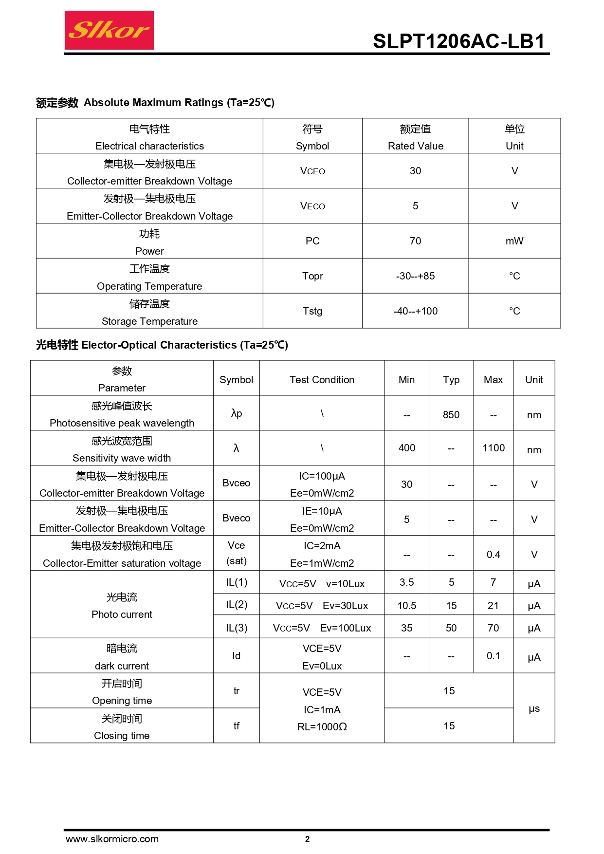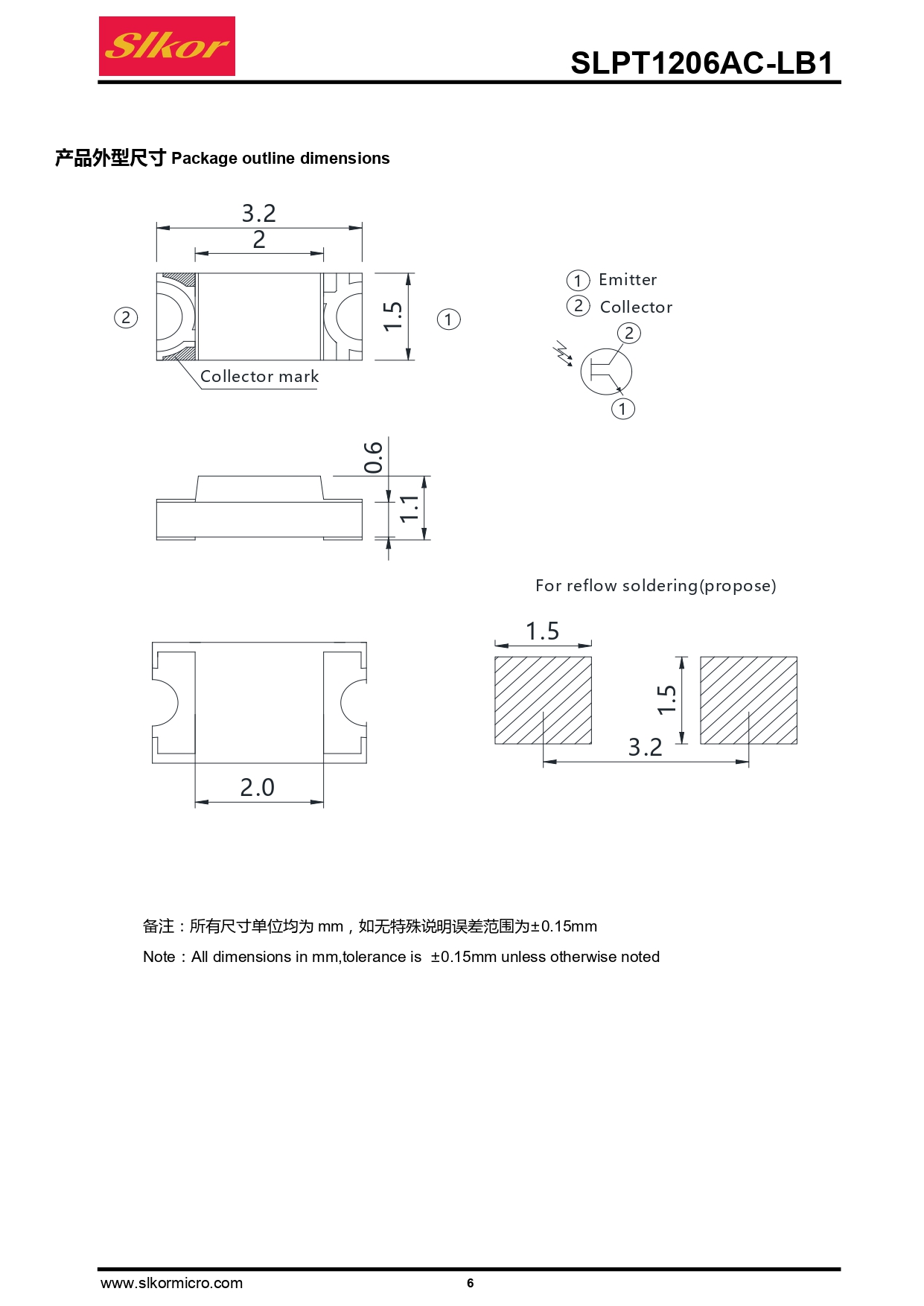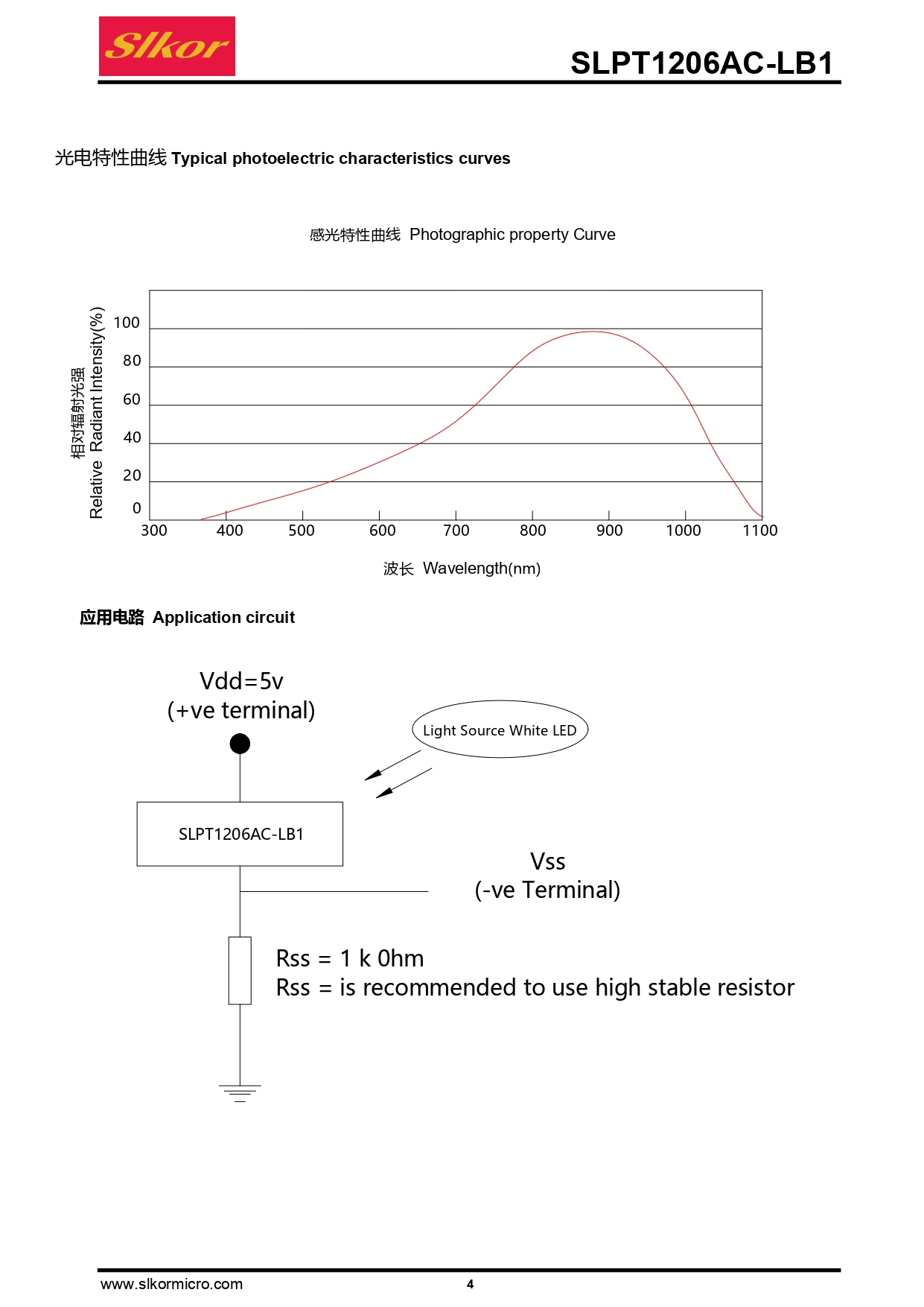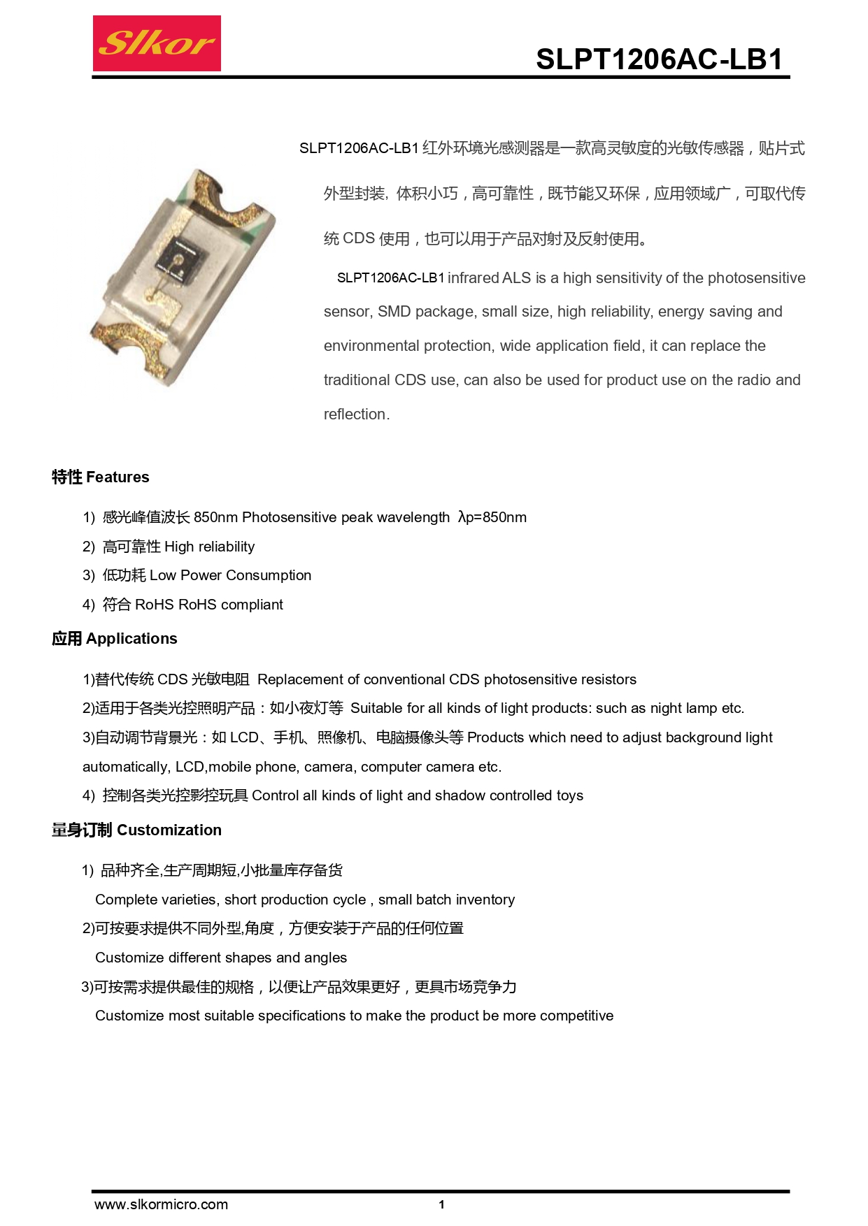 SLPT1206AC-LB1 infrared LED is a high sensitivity of the photosensitive sensor, SMD package, small size, high reliability, energy saving and environmental protection, wide application field, it can replace the traditional CDS use, can also be used for product use on the radio and reflection.